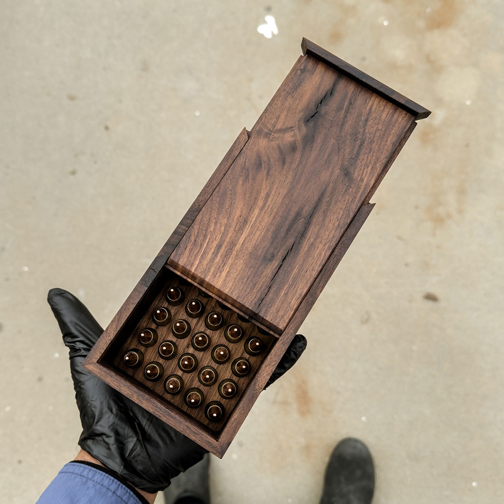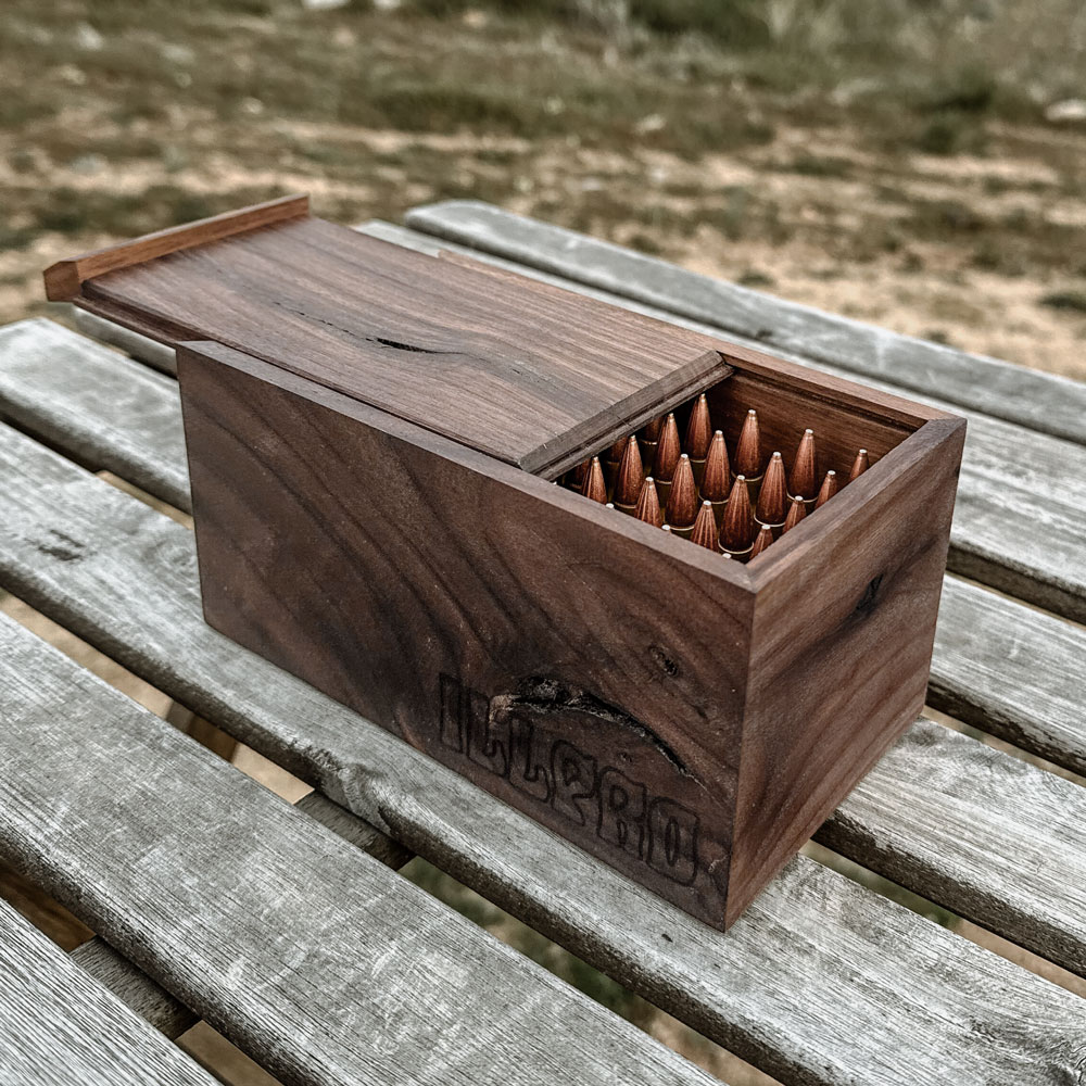 The Field Crate is a handmade ammunition box crafted in the USA from character walnut, giving each piece its own unique grain, tone, and markings. Designed to hold 50 rounds, it offers a clean, compact way to store and carry your ammunition with a level of craftsmanship rarely seen in field gear.