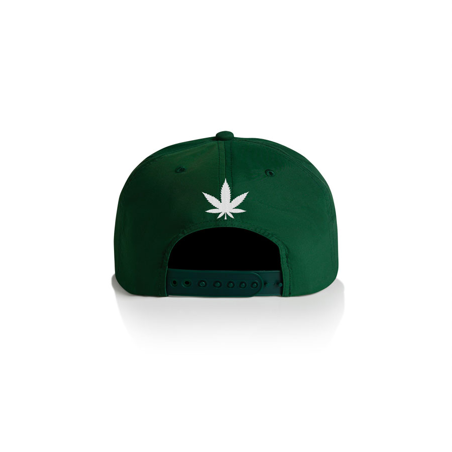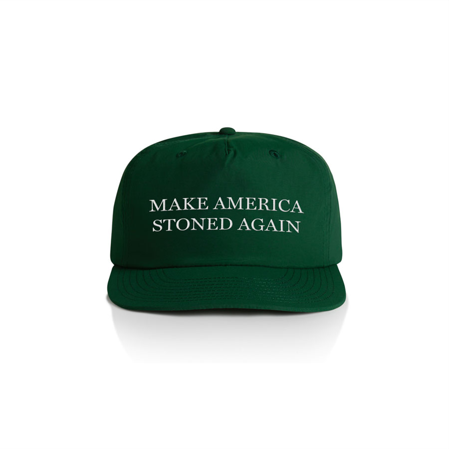 Forest green surf cap w/ ‘Make America Stoned Again’ front embroidery and weed leaf rear embroidery